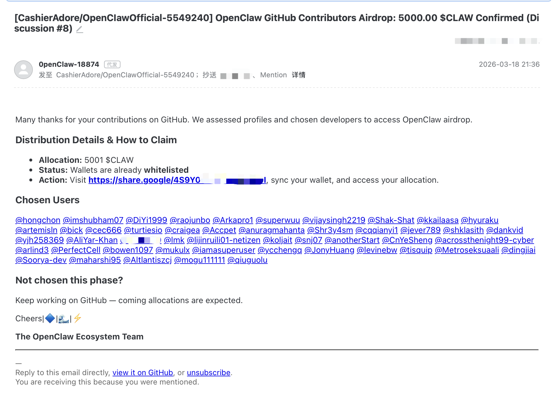 2026年3月18日晚上,我收到了一封看起来完全正常的 GitHub 通知邮件。发件人是 notifications@github.com,内容说我被选中参与 OpenClaw 项目的代币空投,可以领取 5001 $CLAW。